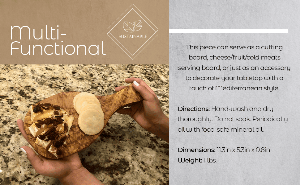 MULTI-FUNCTIONAL. This piece can serve as a cutting board; cheese/fruit/cold meats serving board; or just as an accessory to decorate your tabletop with a touch of Mediterranean style!