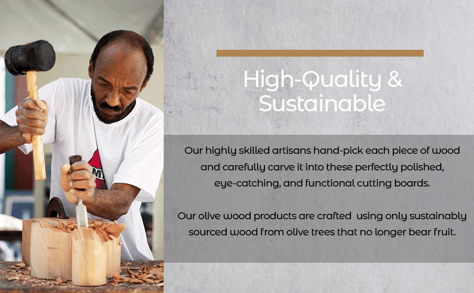 SUSTAINABLE. Our olive wood products are crafted in a family-owned woodshop using only sustainably sourced wood from olive trees that no longer bear fruit.